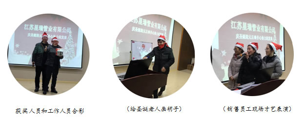 本次圣诞活动主题是庆圣诞,迎元旦,齐心协力迎发展,活动开始前,全体员工饱餐一顿,各种各样的菜肴,色香味俱全,搭配一点小酒,大家吃得都相当尽兴。待员工陆陆续续吃完,大家一起玩起了游戏,游戏内容丰富多彩,有圣诞老人画胡子,顶气球比赛,在报纸上跳舞,抢凳子等等,员工还即兴表演了自己的拿手好戏,每个在场员工无不欢腾,现场其乐融融。大家分组玩游戏,通过团队协作,赢得比赛奖品,同时各个员工之间的感情得到进一步升华。